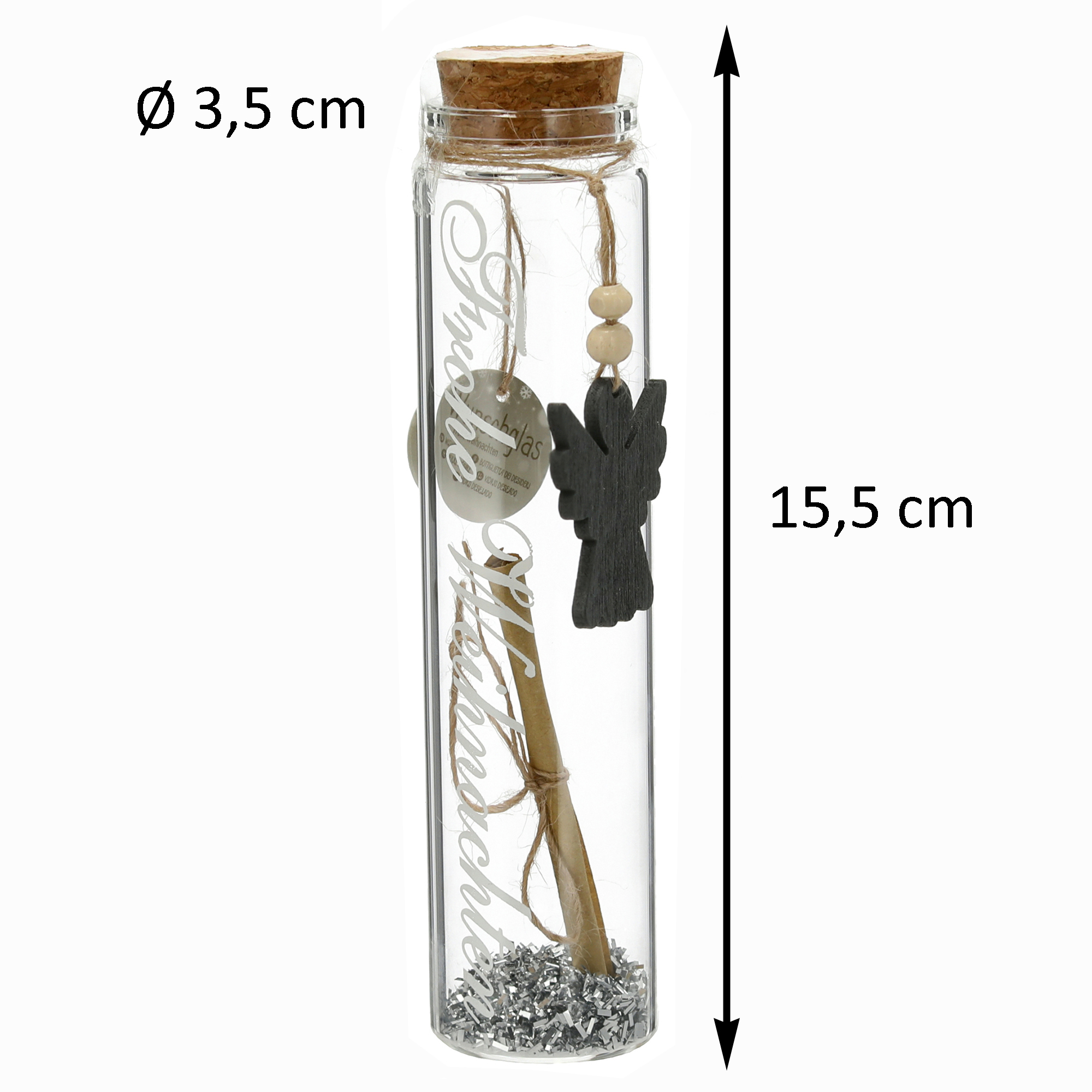 Tolles Wunschglas mit Aufdruck "Frohe Weihnachten" für Geldgeschenke. Die Glasröhrchen sind liebevoll mit Korken zum Verschließen und aufwendig mit Schutzengelanhänger gearbeitet. Die Geldgeschenk-Verpackung ist ideal zum Verschenken von Weihnachtsgeld oder Gutscheinen. Geldgeschenke sind äußerst beliebt, man muss weder einen Kassenbon aufheben noch was umtauschen, auch gibt es keine enttäuschten Gesichter. Im Glas befindet sich dekorativer Wunschstaub.