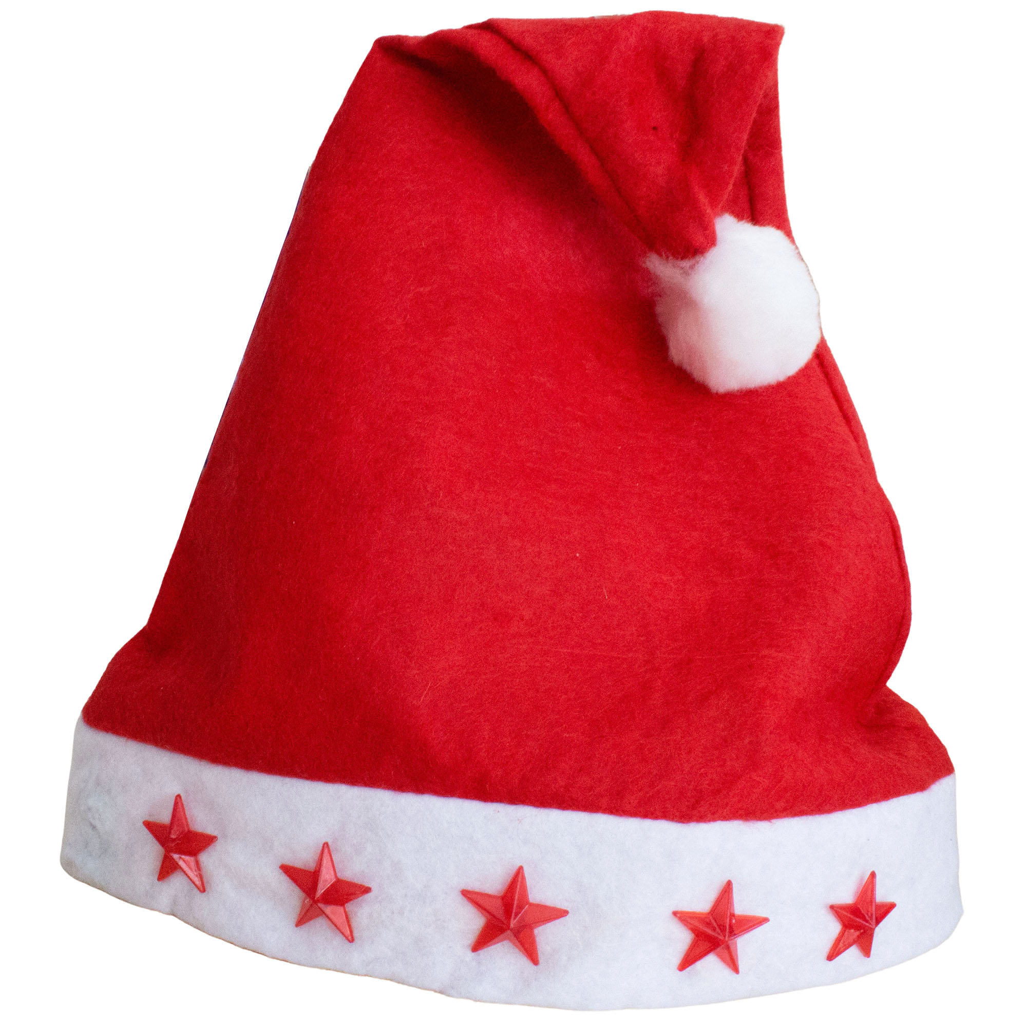 Klassische Weihnachtsmützen aus rotem Polyester-Filz mit süßem weißem Bommel aus Plüsch verziert. Die Leuchtsterne werden mit Batterie betrieben und haben einen Schalter On/Off. Unverzichtbares Accessoires in der Adventszeit.